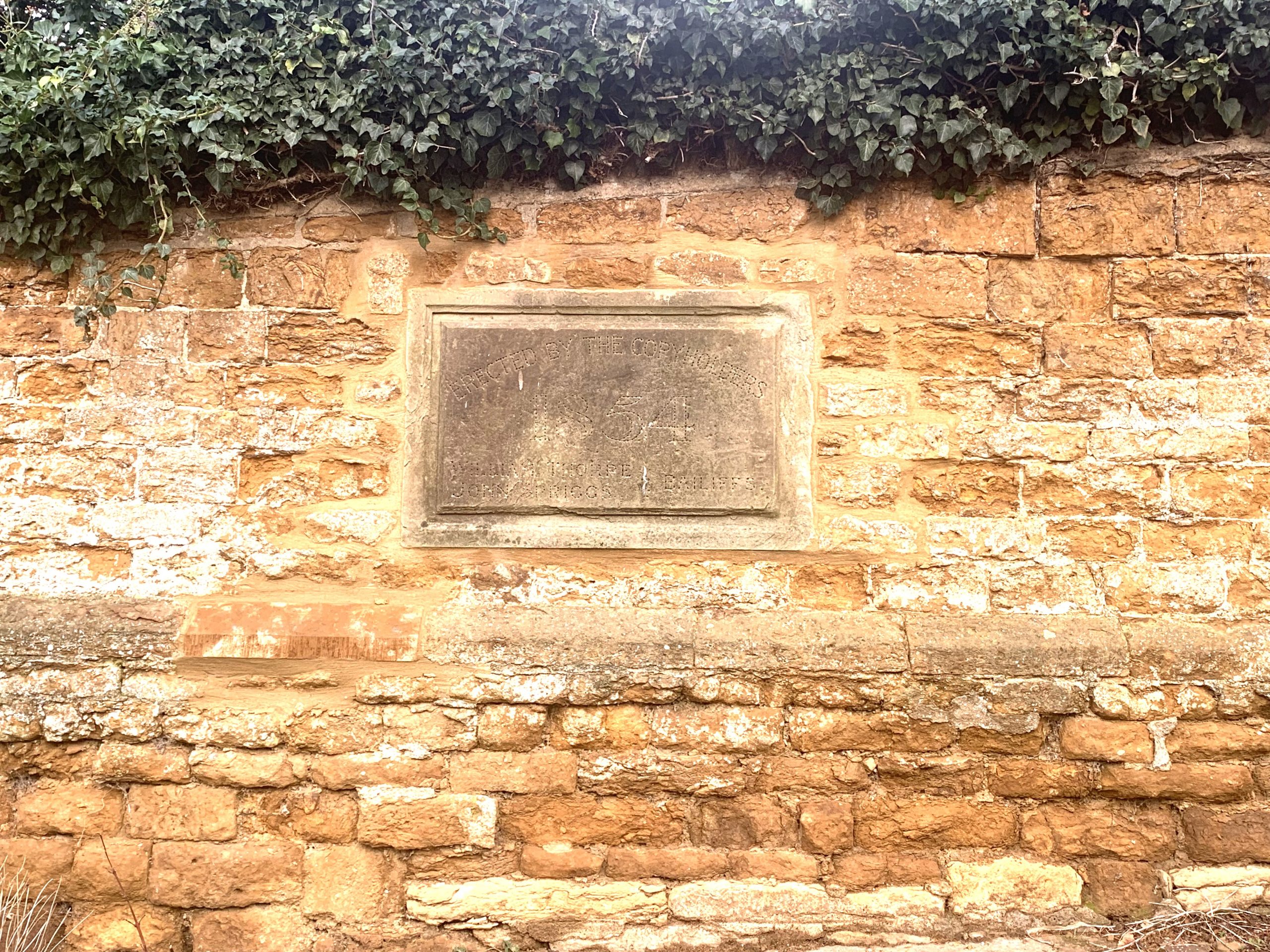 To commemorate the event, the stone tablet that you can see in the pictures below was installed in the wall above the pump at the wellhead, that used to stand on the corner of Corby Road. The words and numbers were originally made of lead pegged into the stone.